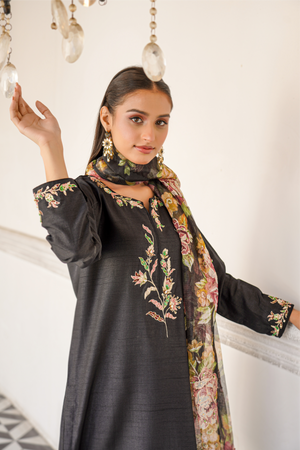 Shirt: This Raw Silk shirt features elegant neckline embroidery and delicate cutwork hand embroidery on the sleeves.
