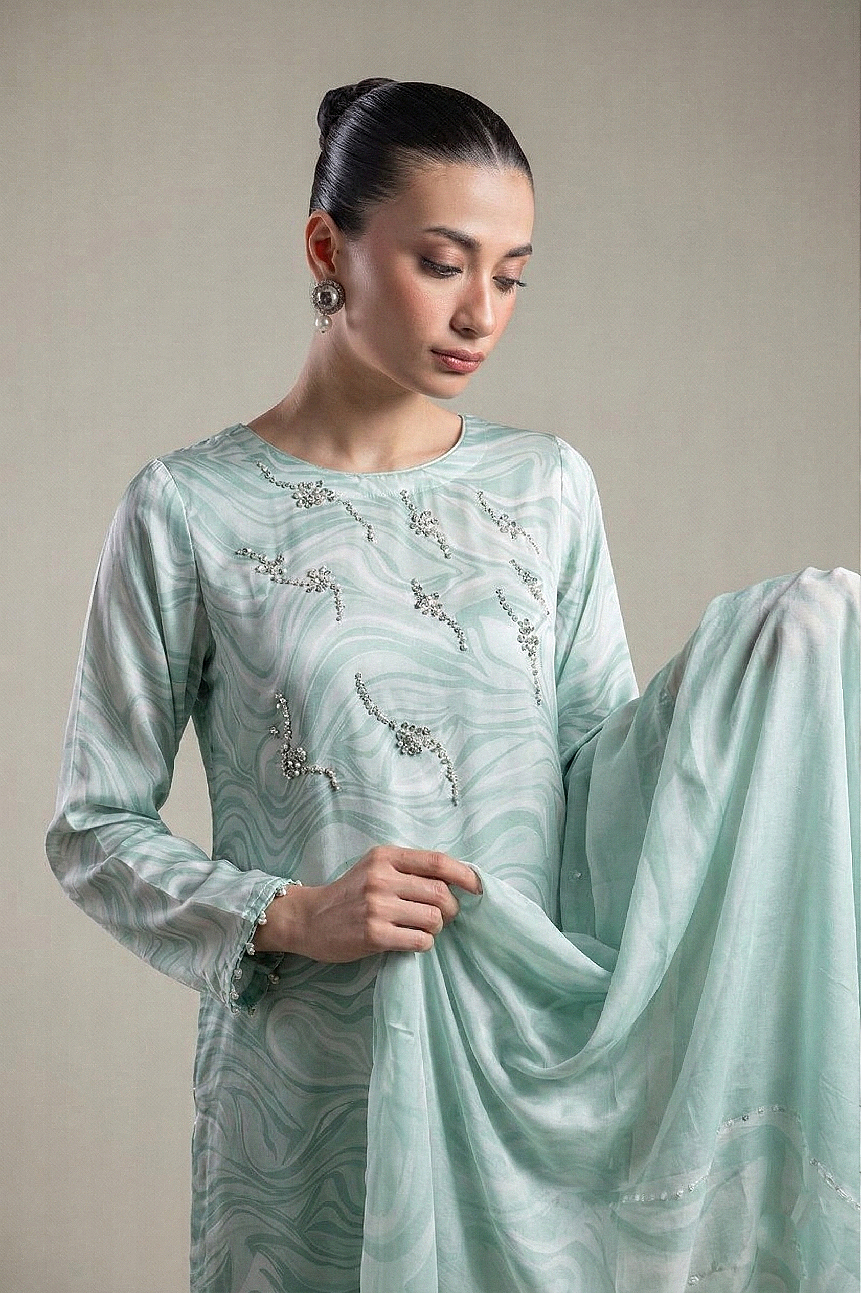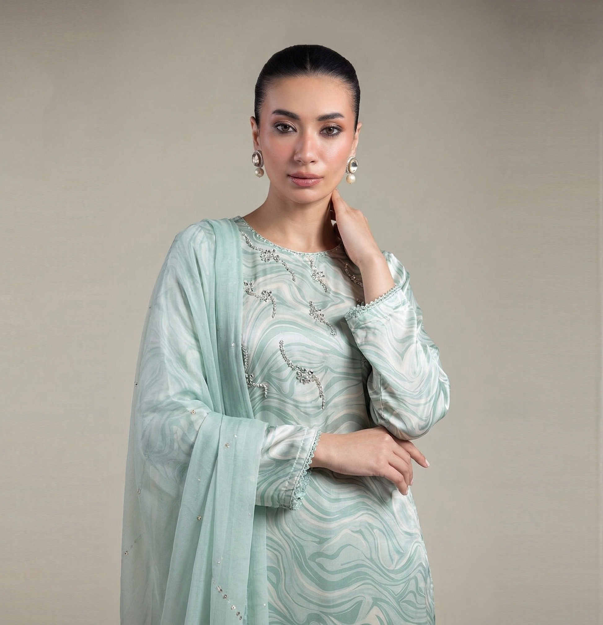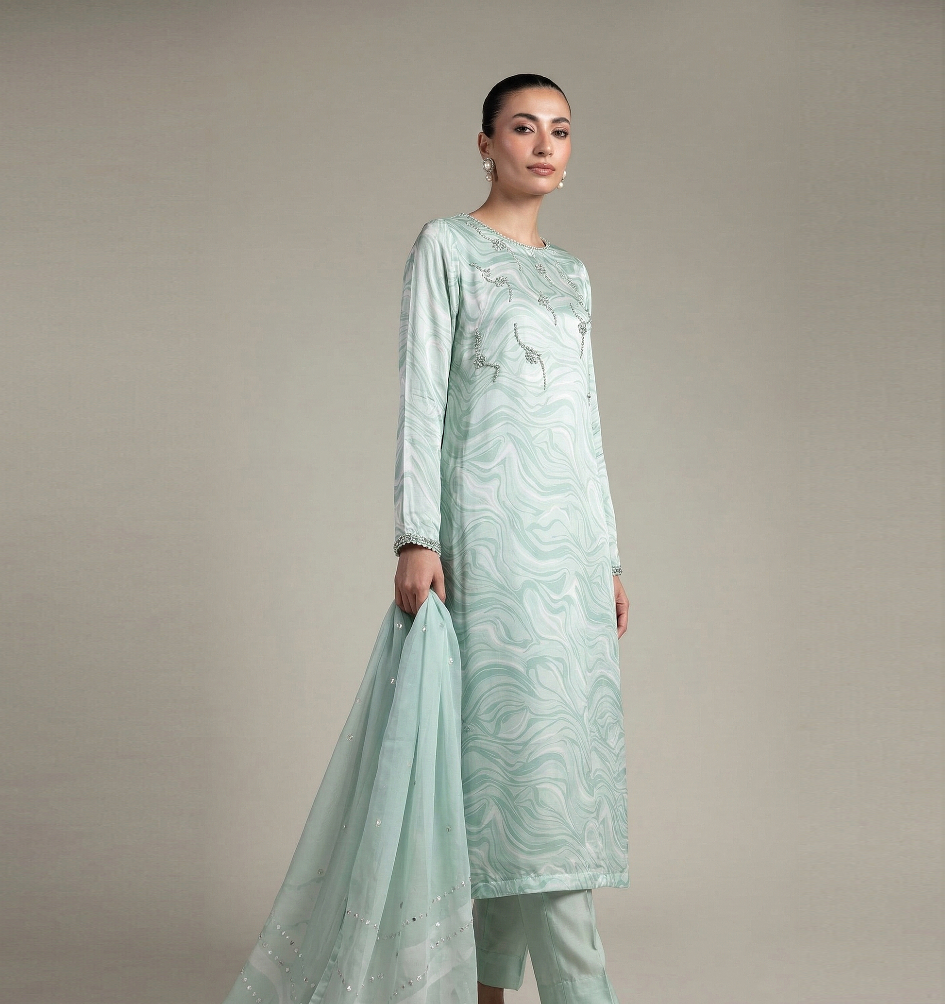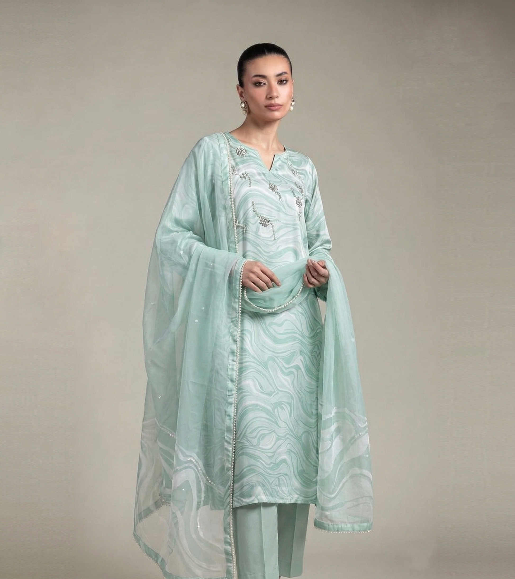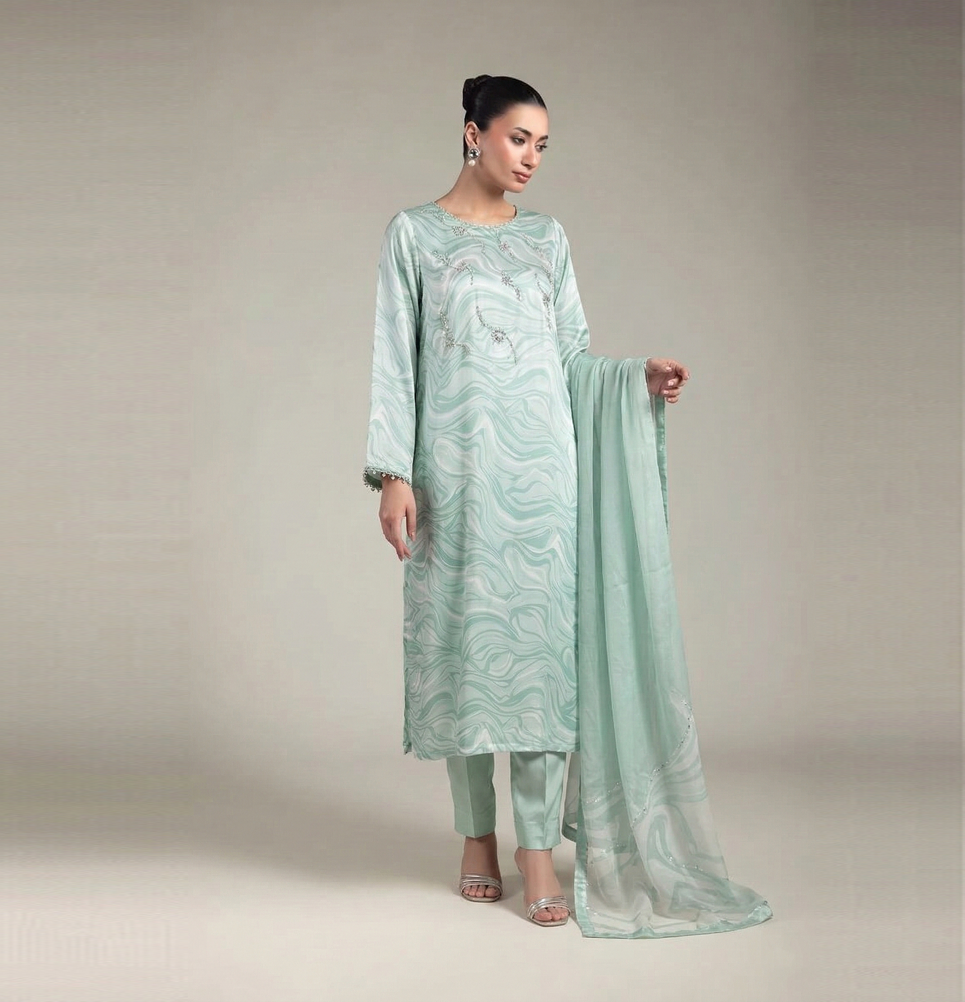 Elevate your wardrobe with this exquisite three-piece ensemble featuring a printed silk shirt adorned with intricate hand embroidery on the front. The set includes smooth silk trouser pants and a flowing chiffon dupatta, creating a sophisticated look perfect for special occasions. Each piece is crafted with attention to detail, combining traditional artistry with refined elegance. Ideal for weddings, celebrations, or formal gatherings, this outfit showcases timeless Pakistani craftsmanship and style.