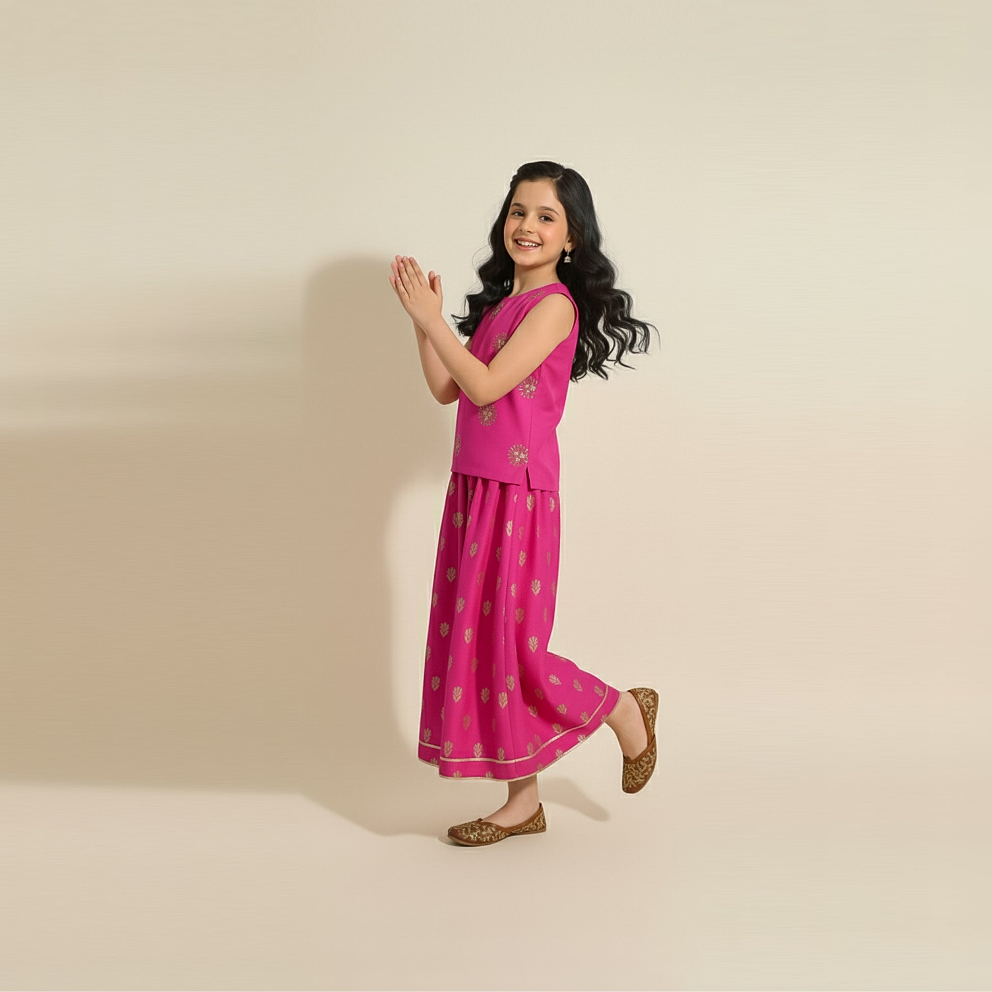 Elevate your child's festive wardrobe with this exquisite two-piece formal outfit, meticulously crafted for weddings and celebrations. The front features intricate hand embroidery that showcases traditional artistry, while the lehenga is adorned with premium gold printing that catches light beautifully. This sophisticated ensemble combines timeless elegance with superior craftsmanship, ensuring your child stands out at any special occasion. Perfect for creating memorable moments in style.