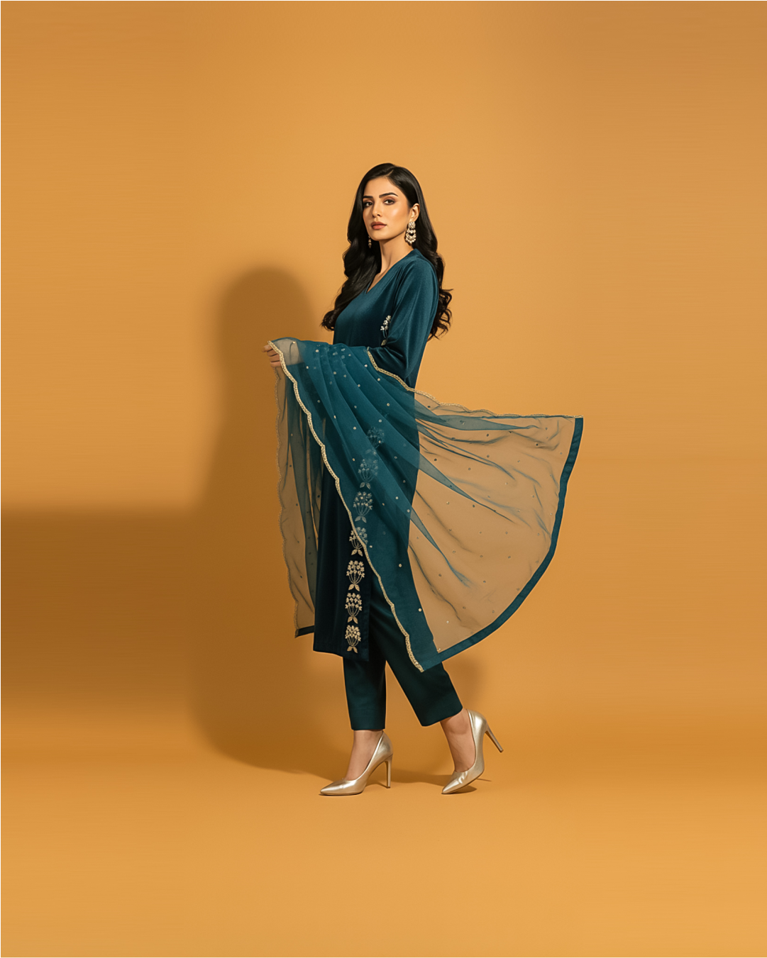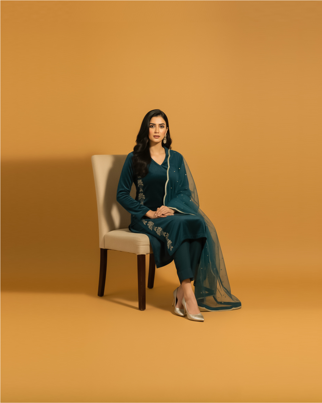 This elegant 3-piece micro velvet outfit features intricate handwork meticulously crafted on both sides of the shirt front and sleeves, enhancing its sophisticated appeal. Complemented by a delicate organza dupatta adorned with embroidered scallops, this ensemble is perfect for formal occasions, offering a luxurious blend of texture and detailed craftsmanship for a refined and graceful look.