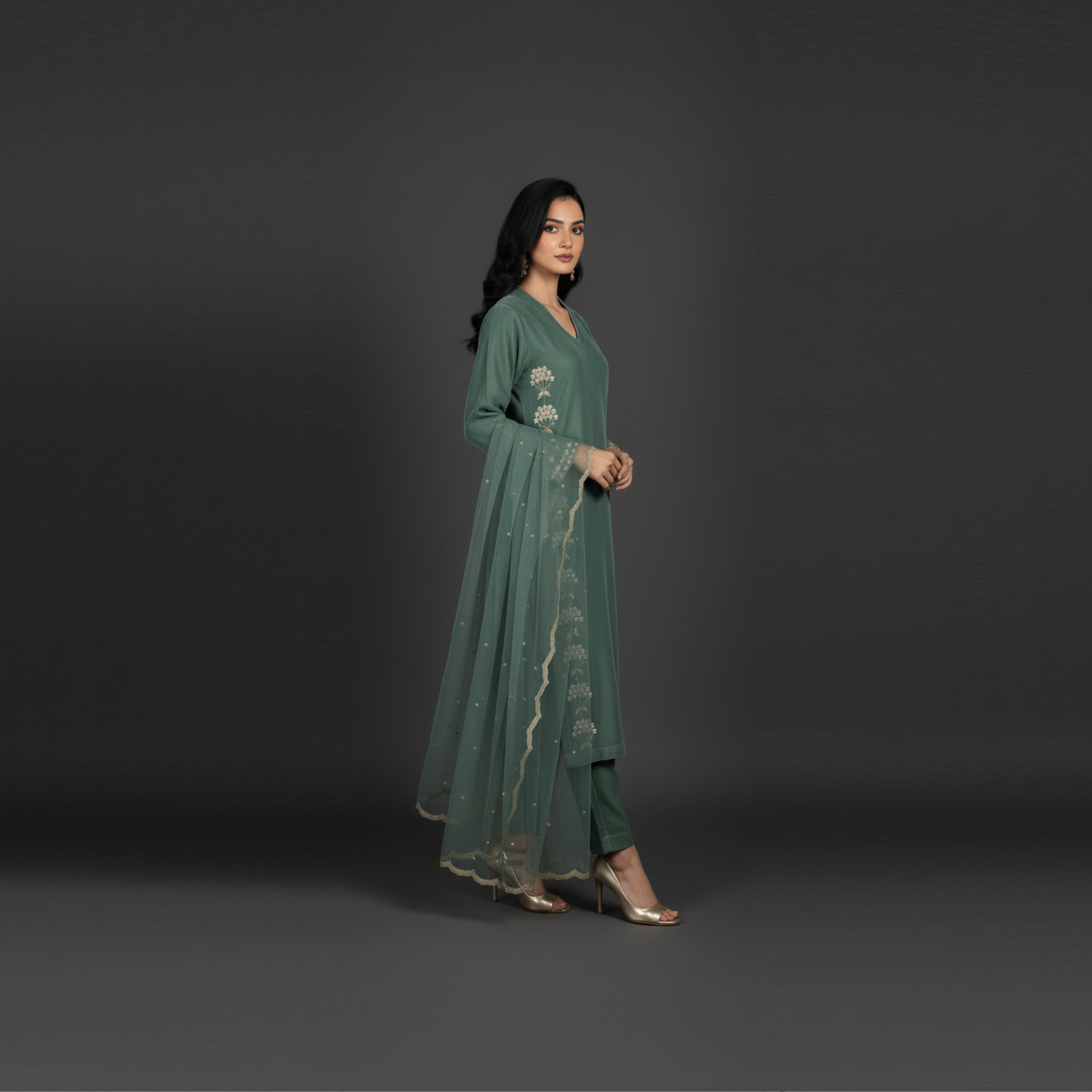 This elegant 3-piece micro velvet outfit features intricate handwork meticulously crafted on both sides of the shirt front and sleeves, enhancing its sophisticated appeal. Complemented by a delicate organza dupatta adorned with embroidered scallops, this ensemble is perfect for formal occasions, offering a luxurious blend of texture and detailed craftsmanship for a refined and graceful look.