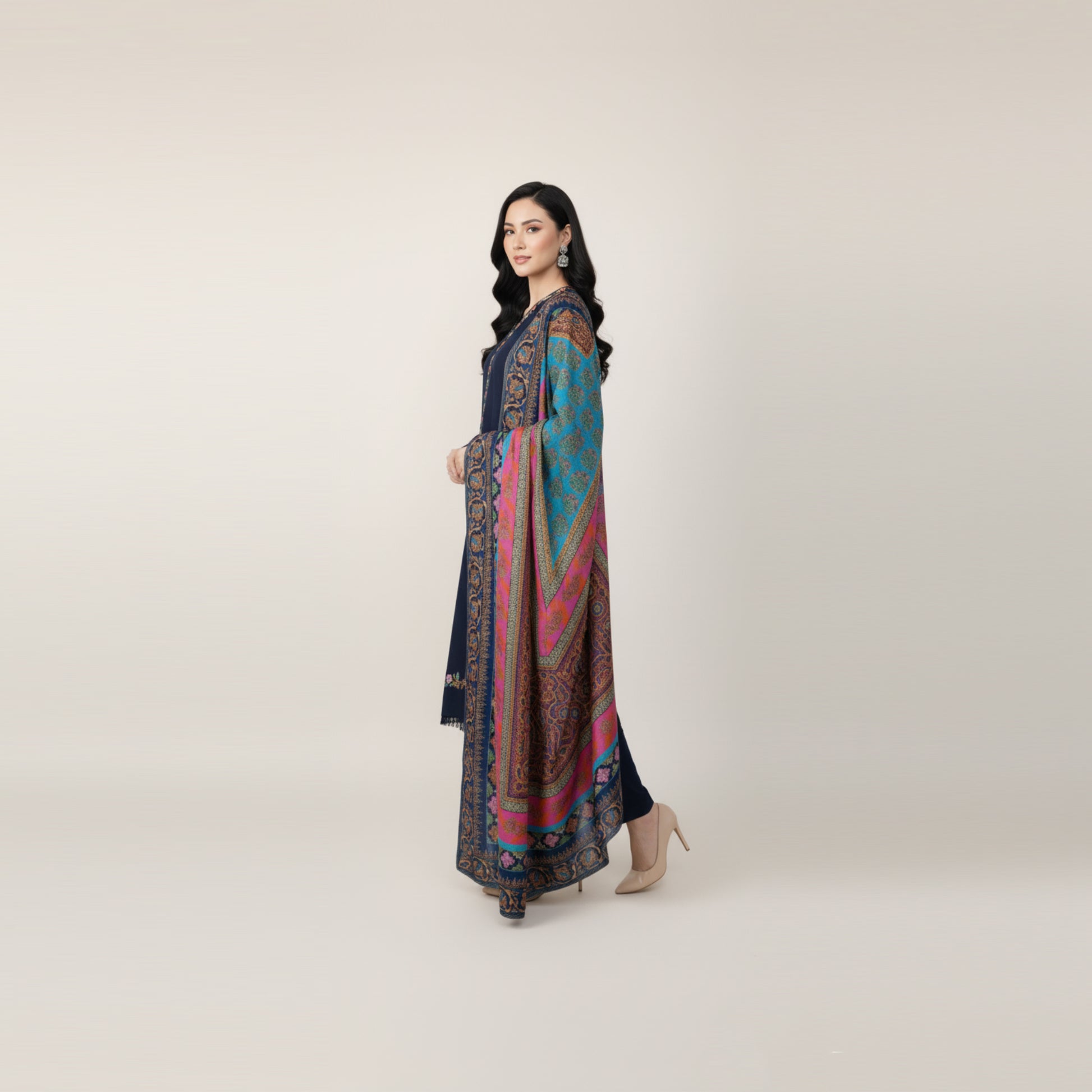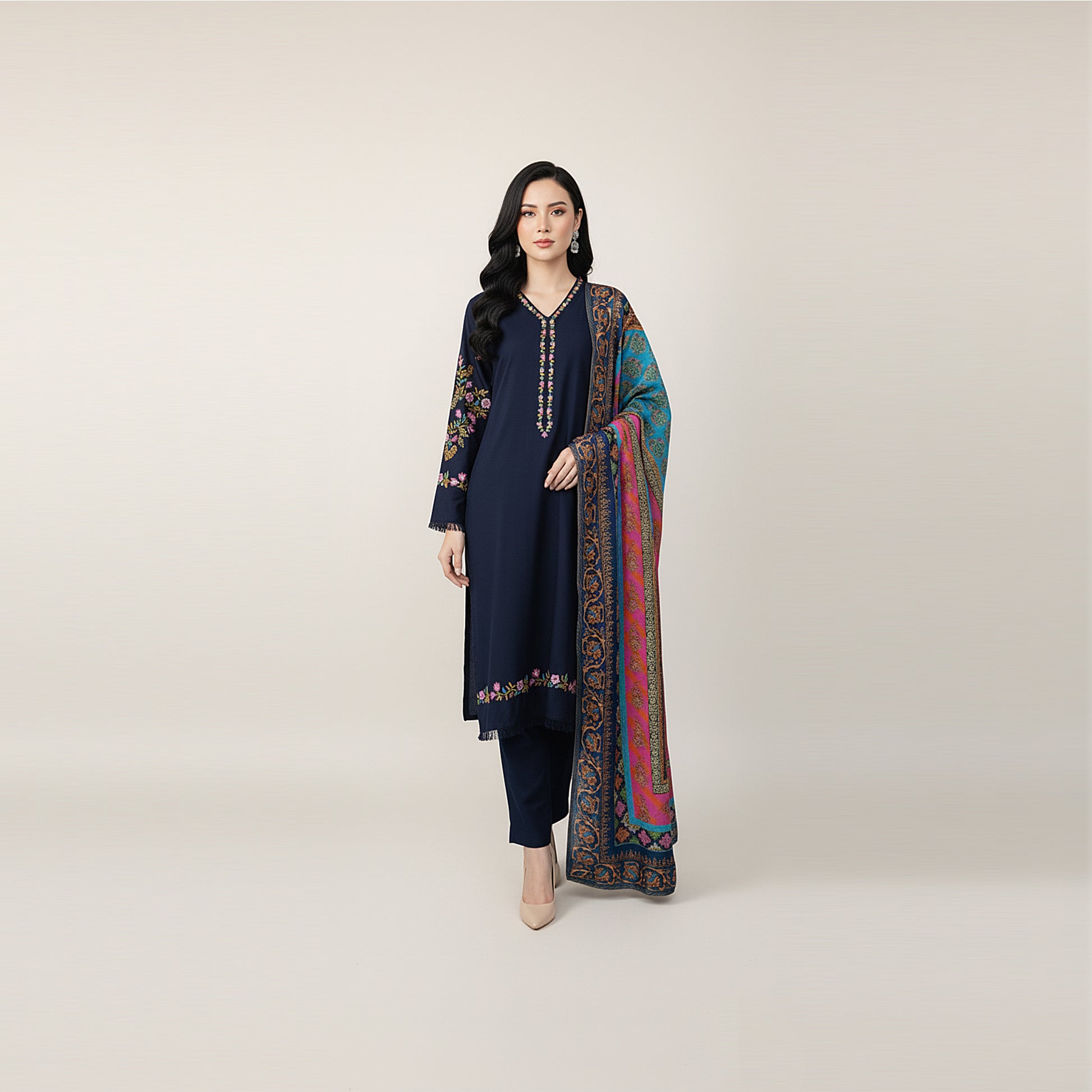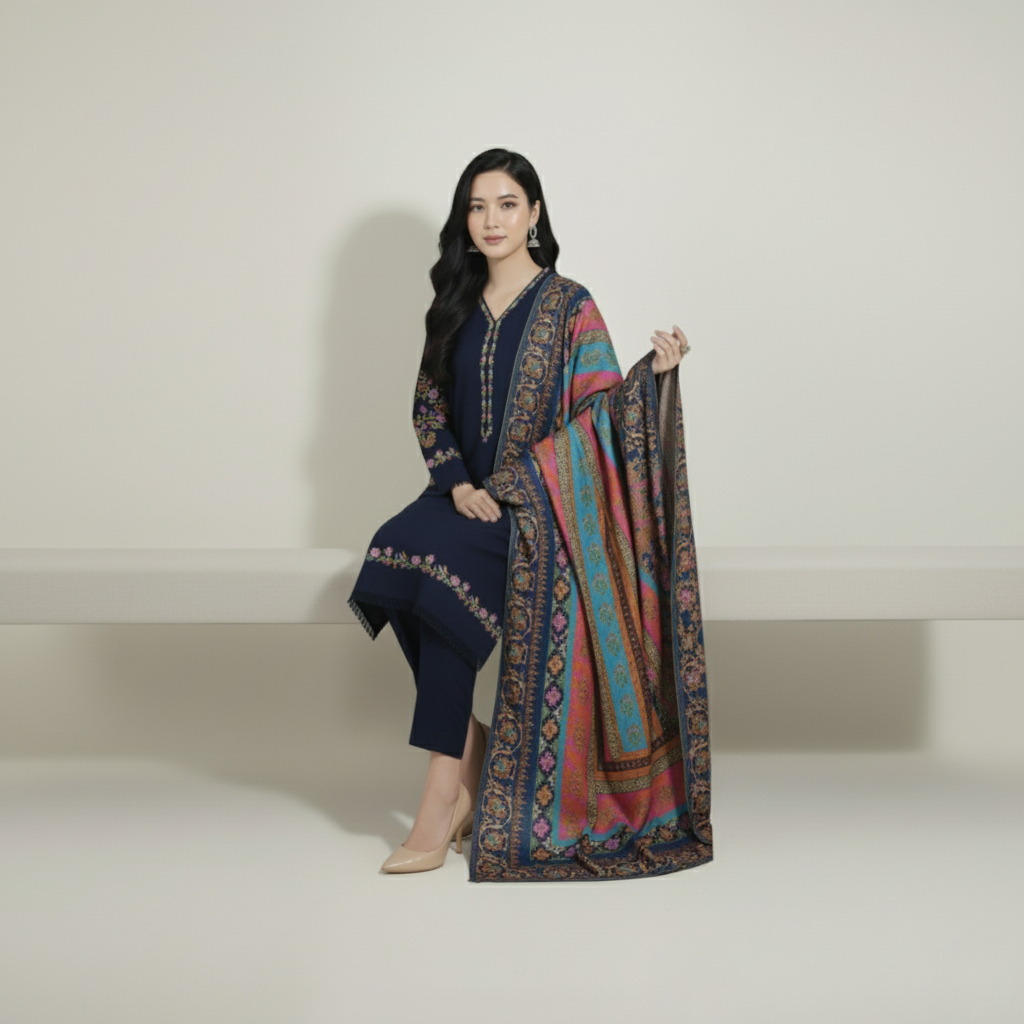 This ink blue linen fabric three-piece outfit features intricate multi-color embroidery on the sleeves and shirt front, adding a rich, detailed texture perfect for winter. Complemented by a beautifully designed printed shawl, this ensemble blends traditional craftsmanship with seasonal warmth, making it an elegant and comfortable choice for colder days.
