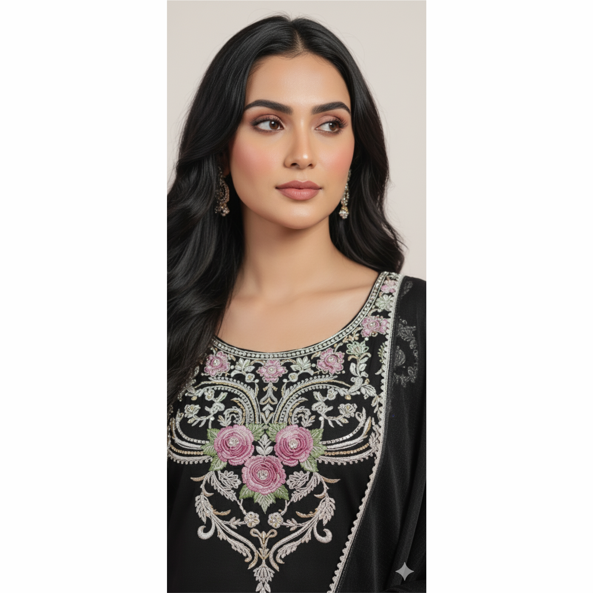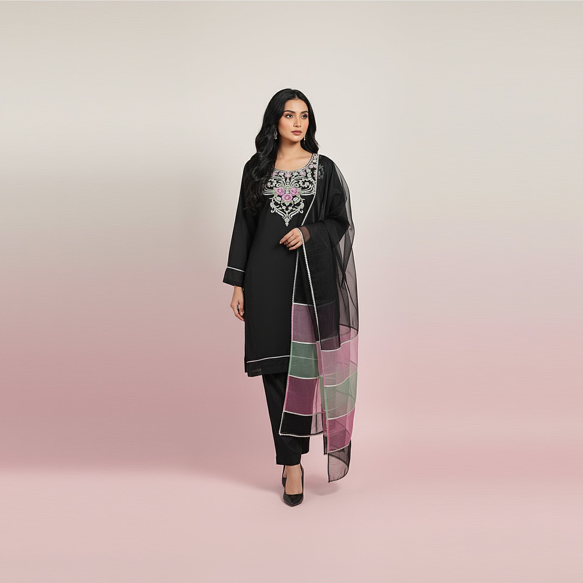Elevate your wardrobe with this 3-piece outfit featuring a luxurious solid black silk shirt and shalwar, refined by intricate embroidery along the neckline. The premium stitching enhances the outfit’s sophisticated style, while the multi-colour organza dupatta edged with delicate laces adds a graceful, vibrant contrast. Perfect for formal occasions, this ensemble blends rich textures and expert craftsmanship for a timeless, elegant look.