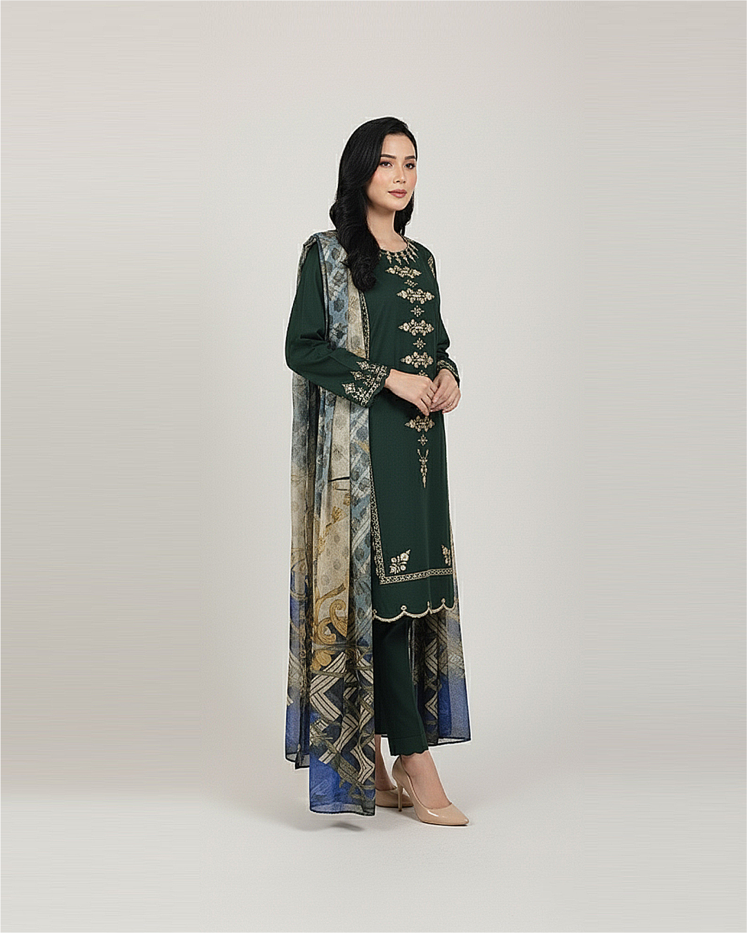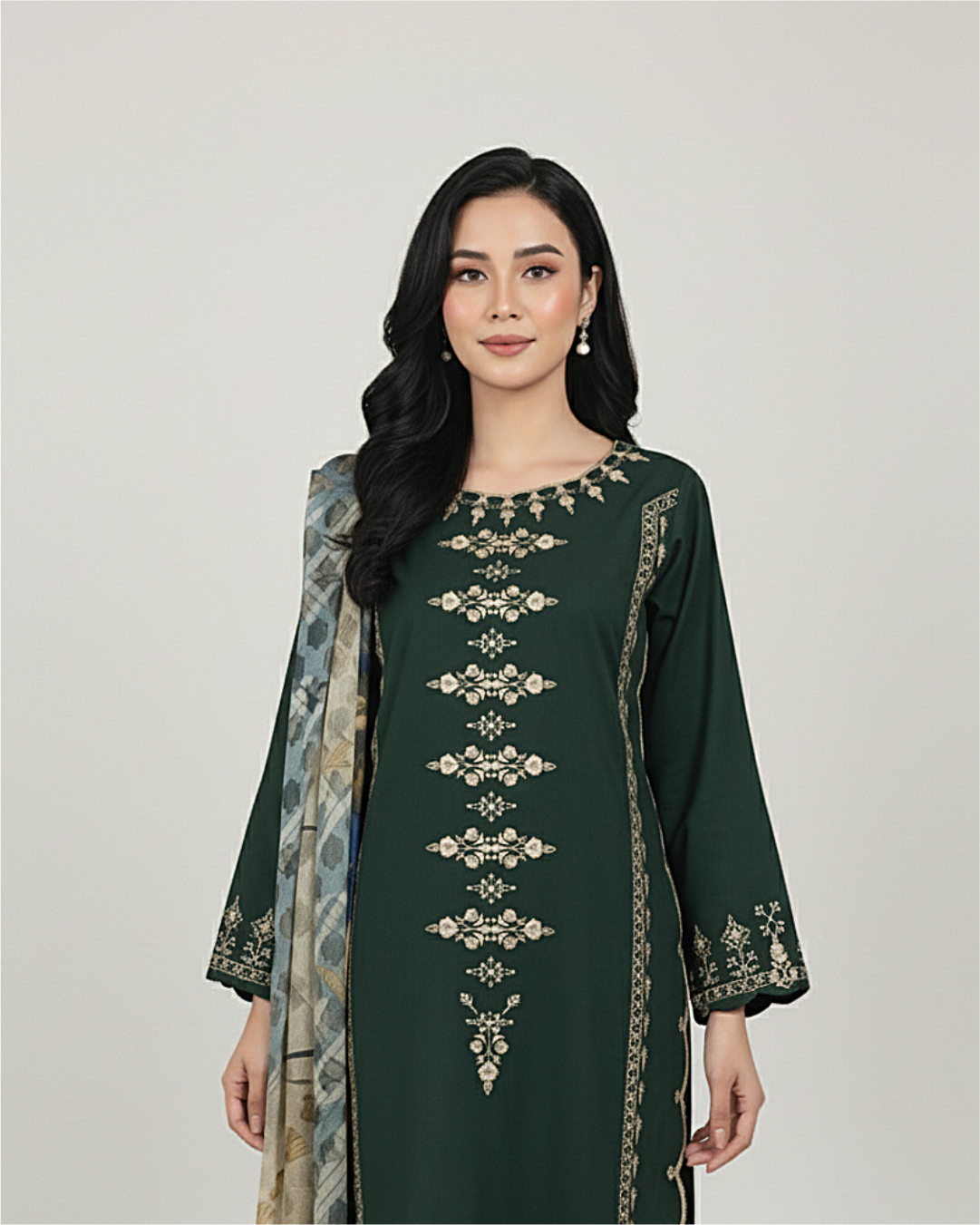 This elegant three-piece winter outfit features a rich bottle green dhanak fabric with intricate embroidery adorning the shirt front and sleeves. The detailed scalloped finishing on the daman and chawk adds refined craftsmanship. Complemented by a printed dupatta, this ensemble balances traditional artistry with sophisticated warmth, perfect for stylish winter occasions.