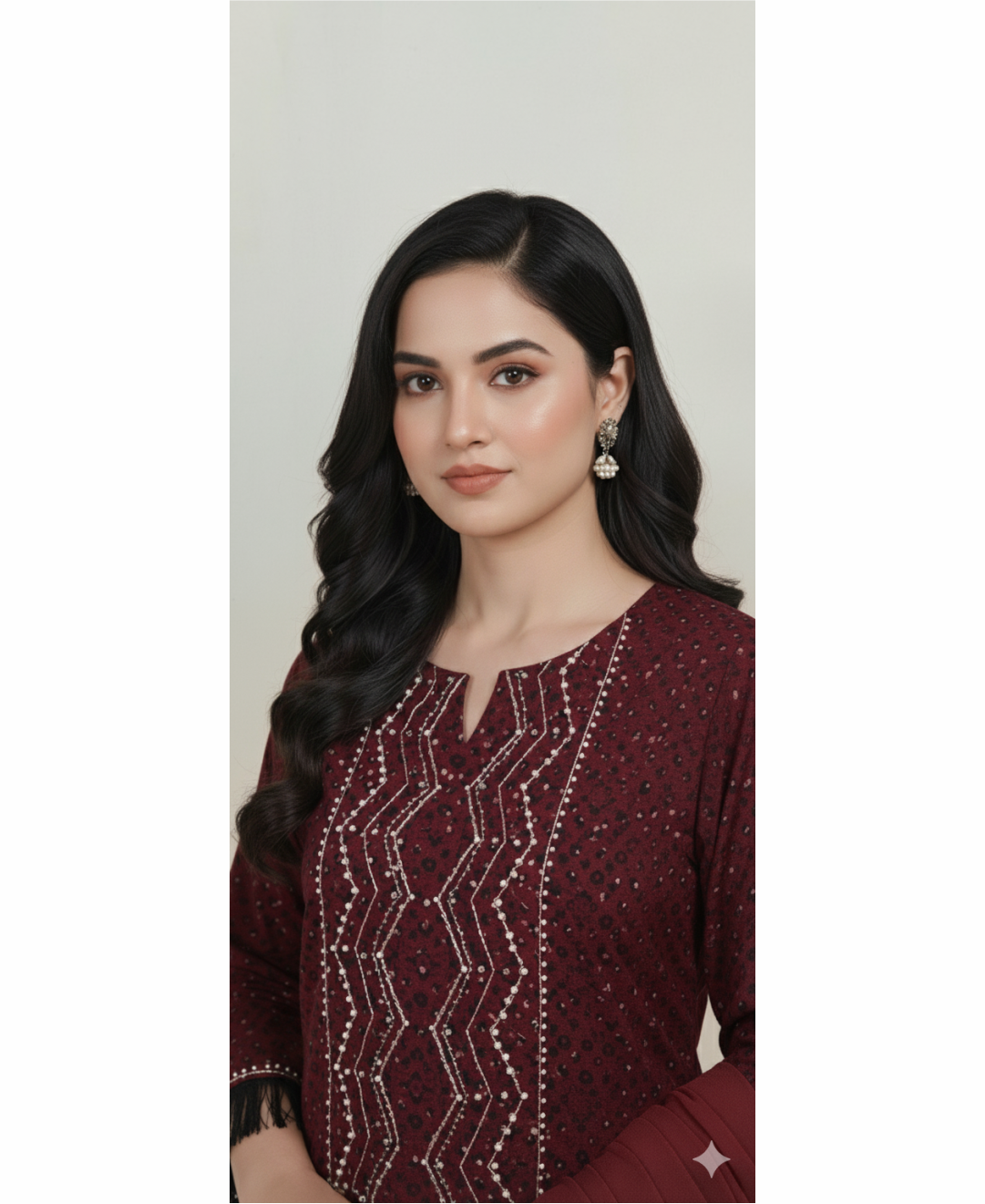This elegant three-piece outfit features a printed grip shirt adorned with exquisite handwork on the front neckline. Delicate lace details enhance the sleeves and daaman, adding a refined touch. The ensemble is completed with a black grip trouser and chiffon dupatta, meticulously finished with handmade tassels on the sides, offering a sophisticated and graceful look for any occasion.