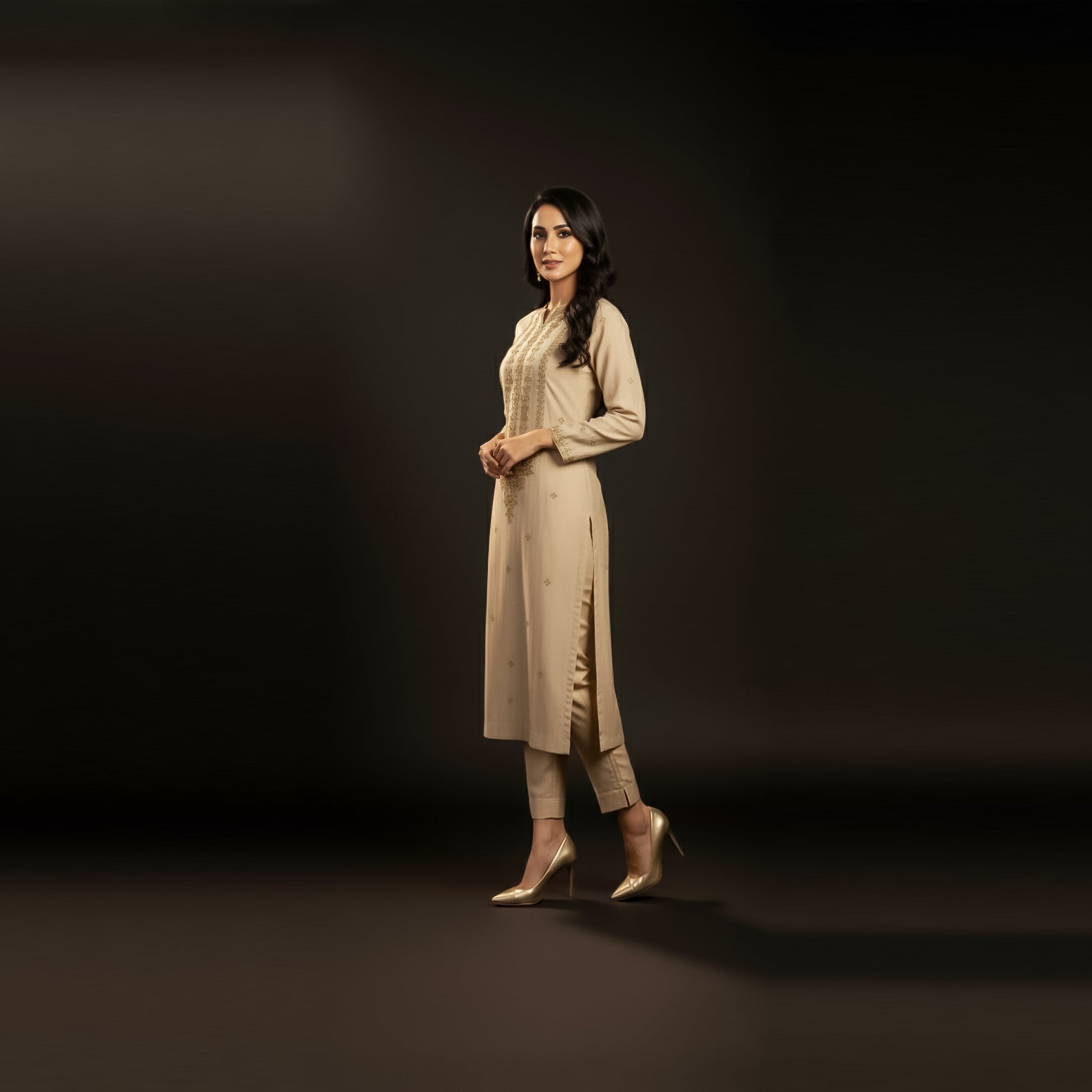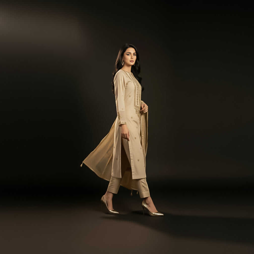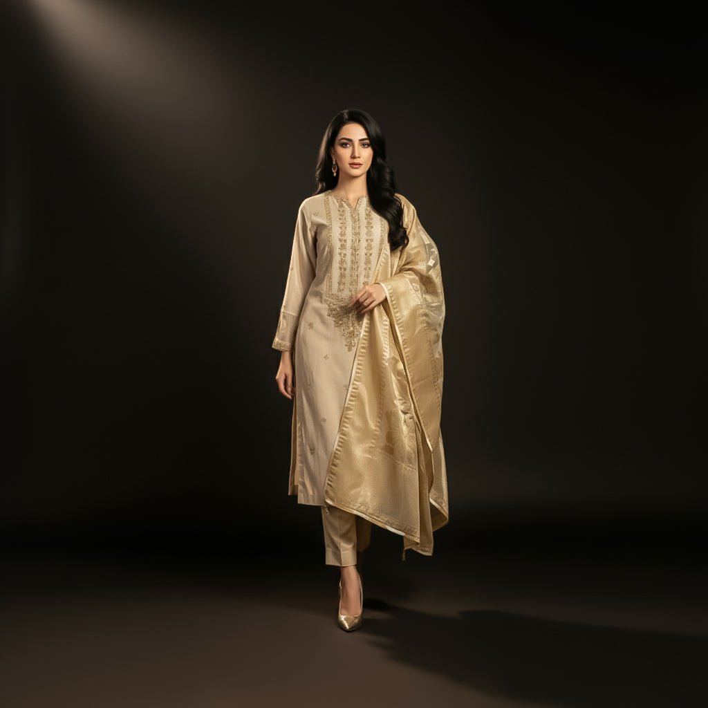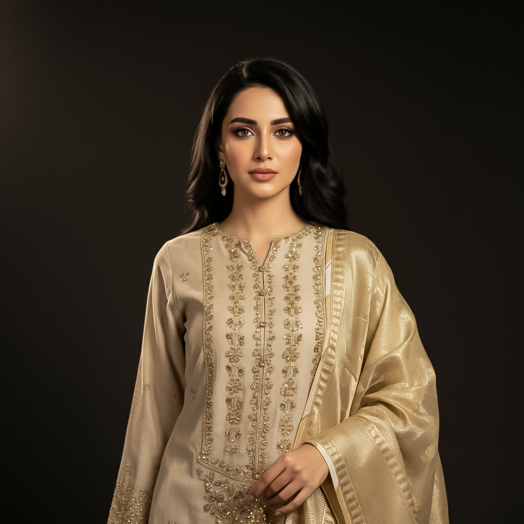 This refined beige khaddi net three-piece formal ensemble represents the pinnacle of bridal craftsmanship. The shirt showcases meticulous machine embroidery and intricate hand embellishments across the front, demonstrating superior artisanal technique. Complemented by a luxurious golden organza jacquard shawl, the ensemble achieves a balanced aesthetic that honors traditional wedding wear standards. The premium fabric selection and detailed embroidery work create a sophisticated silhouette suitable for the most significant occasions, offering both elegance and cultural authenticity for the modern bride seeking timeless bridal attire.