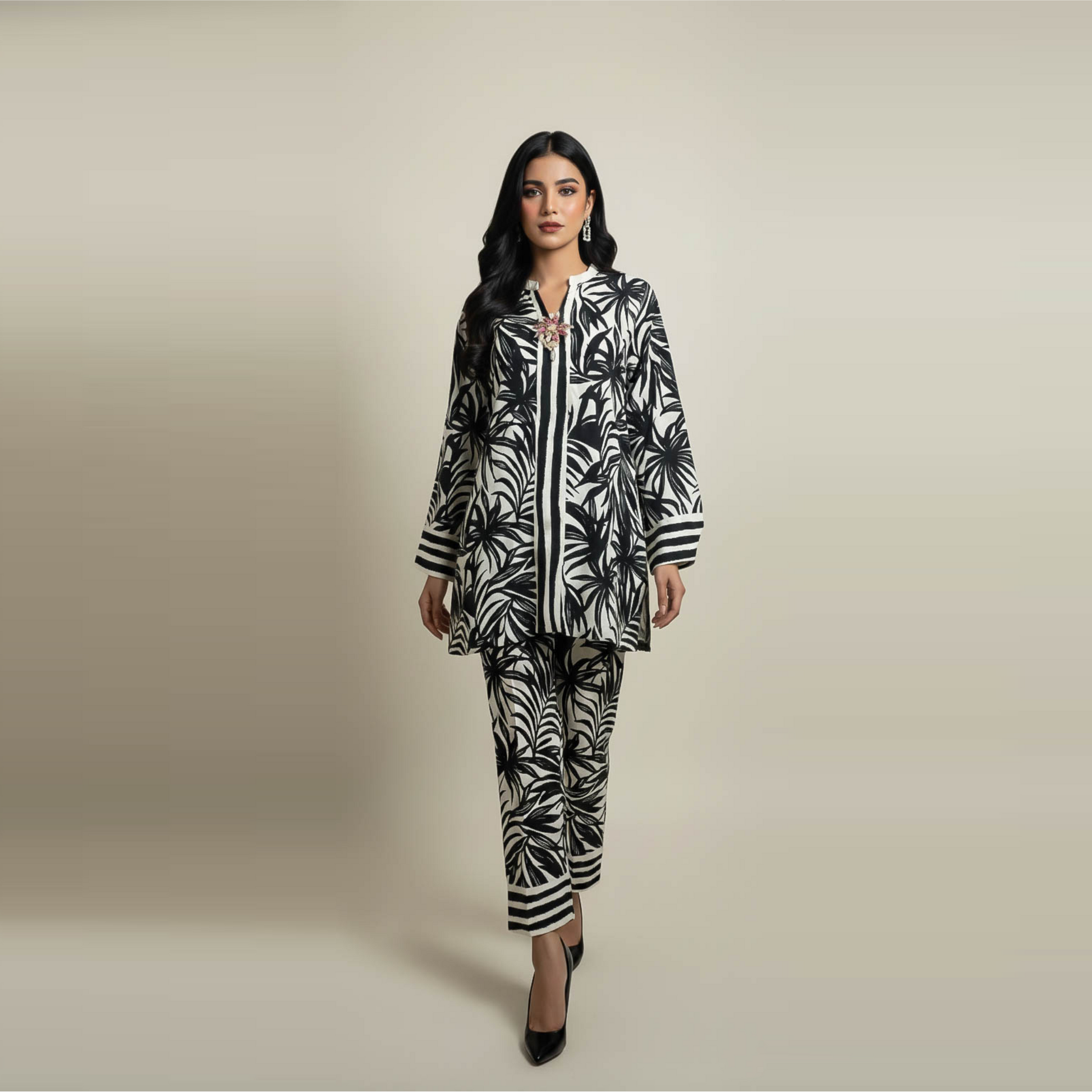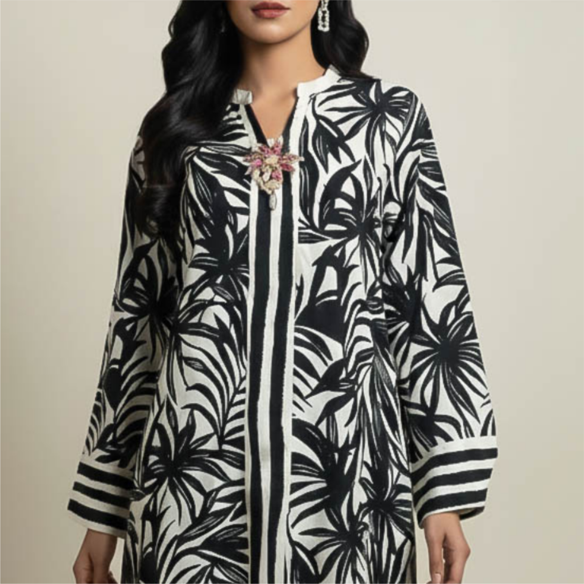 This black and white Jorjot grip printed co'ord is expertly crafted for office and college-going women, combining style and functionality. It features intricate stitching details on the front and sleeves, enhancing its tailored appeal. A delicate handmade floral broach adorns the neckline, adding a unique and elegant finishing touch to a versatile ensemble suitable for professional and academic settings.